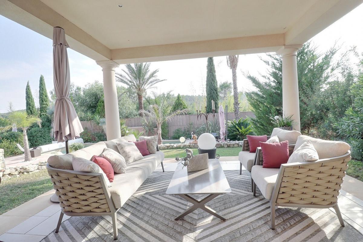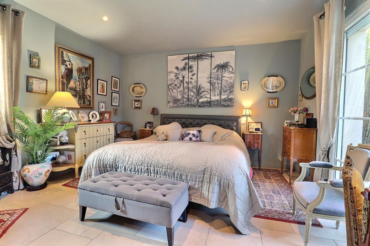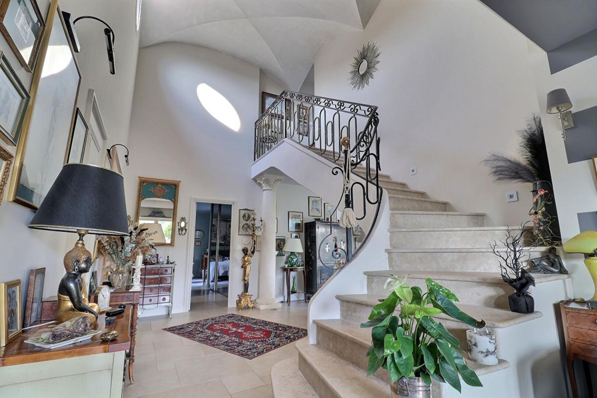 Upon entering, the eye is drawn to the majestic high ceilings, which give an impression of space and grandeur. The ground floor is centered around several light-filled living areas: a cozy living room extended by a covered terrace, a convivial dining room, and a dual-aspect living room that opens onto a Zen garden on one side and the pool area on the other. The fully equipped kitchen opens onto a second shaded terrace, ideal for summer meals.
