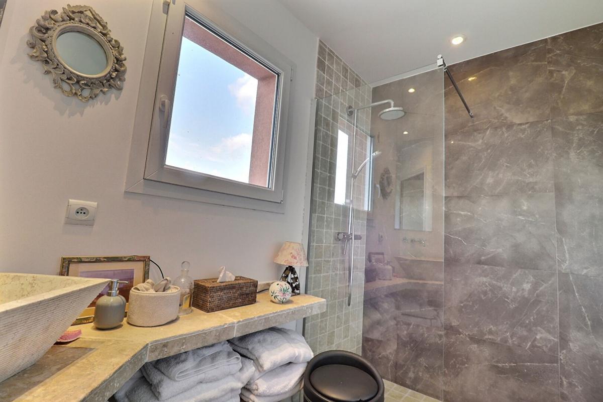 Dès l’entrée, le regard est attiré par une majestueuse hauteur sous plafond qui confère une impression d’espace et de grandeur. Le rez-de-chaussée s’articule autour de plusieurs pièces de vie baignées de lumière : un salon cosy prolongé par une terrasse couverte, une salle à manger conviviale, et un séjour traversant qui s’ouvre sur un jardin zen d’un côté et sur l’espace piscine de l’autre. La cuisine, entièrement équipée, donne accès à une seconde terrasse ombragée, idéale pour les repas d’été.